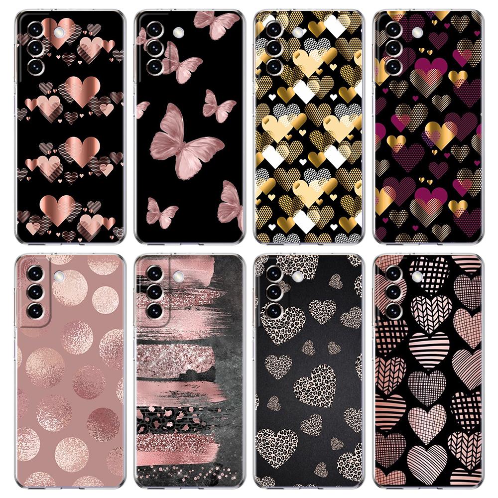 Gold Pink Rose Glitter Hearts Phone Case For Samsung Galaxy S24 Ultra S23 FE S22 S20 S21 5G S10 S9 Plus S10E S8 Soft Clear Cover