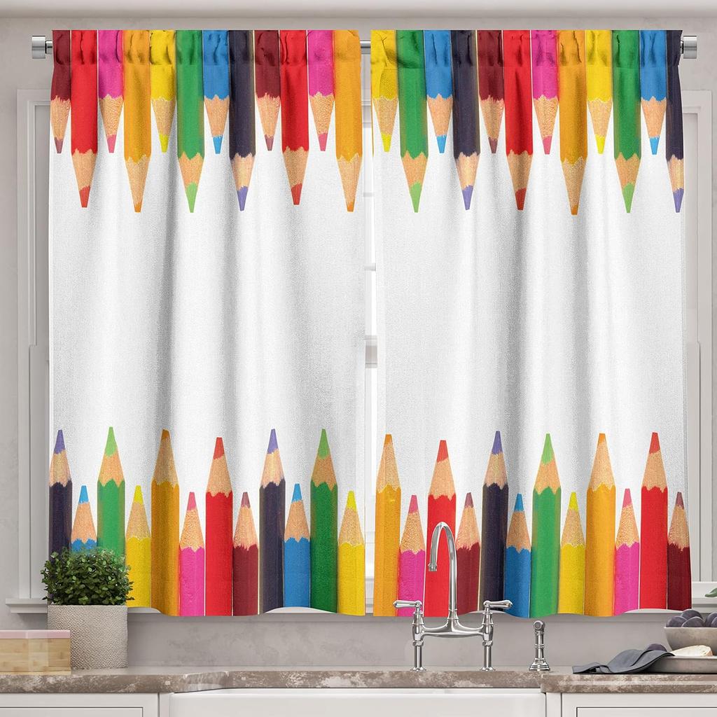 Lunarable Back School Kitchen Curtains Coloured Pencils Children Painting Theme Primary Creativity Abc Print Window Curtain Polyester Perfect For
