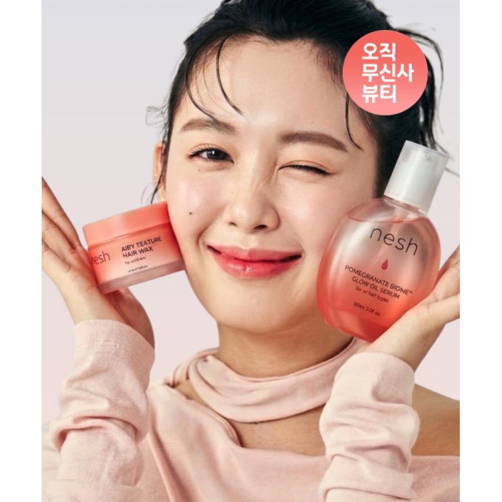 NESH [2-piece set] Airy Texture Hair Wax 50ml & Pomegranate Biome Glow Oil Serum 80ml is a men's hair styling product that boasts a lightweight texture. The airy texture hair wax applies smoothly without stickiness, providing long-lasting hold. The pomegranate biome glow oil serum helps maintain healthy hair by providing moisture and shine.