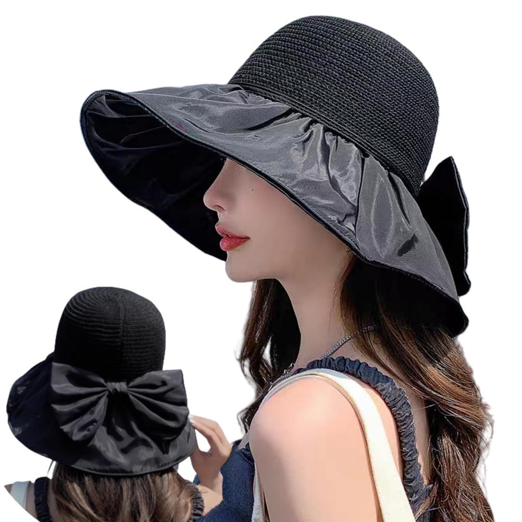[Wdlife] UV Protection Hat for Women, Wide Brim Hat for Sun Protection [UV Protection, Black Sun-Blocking Coating Design for Summer], Foldable, with Storage Bag, Ribbon, Adjustable Chin Strap, Slimming Effect, Breathable, Cute, Stylish, Spring/Summer, Travel, Commuting