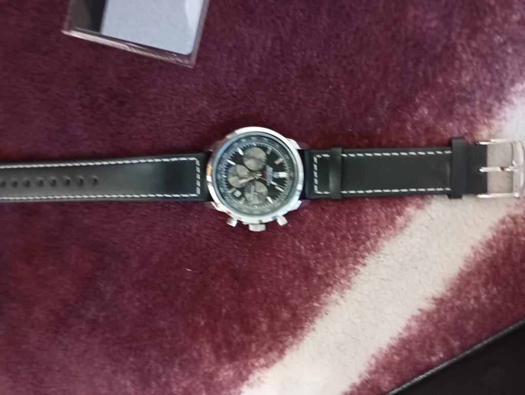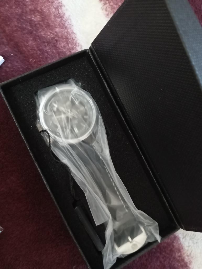 El reloj es fantástico, caja, tarjeta de plástico (garantizada), servilleta para limpiar el cristal), todas las funciones funcionan.