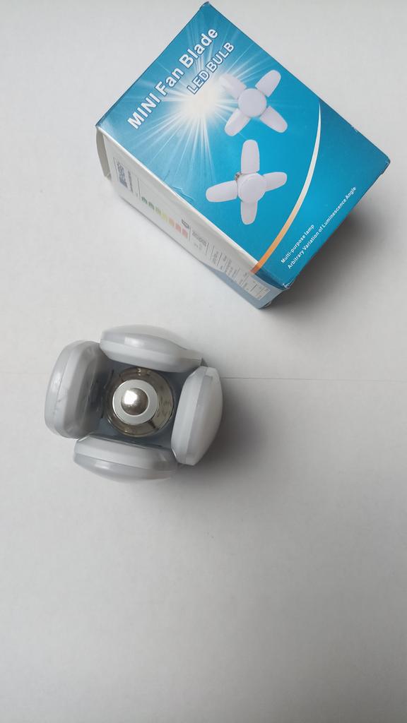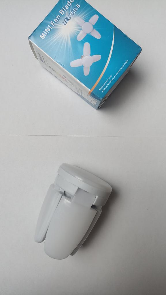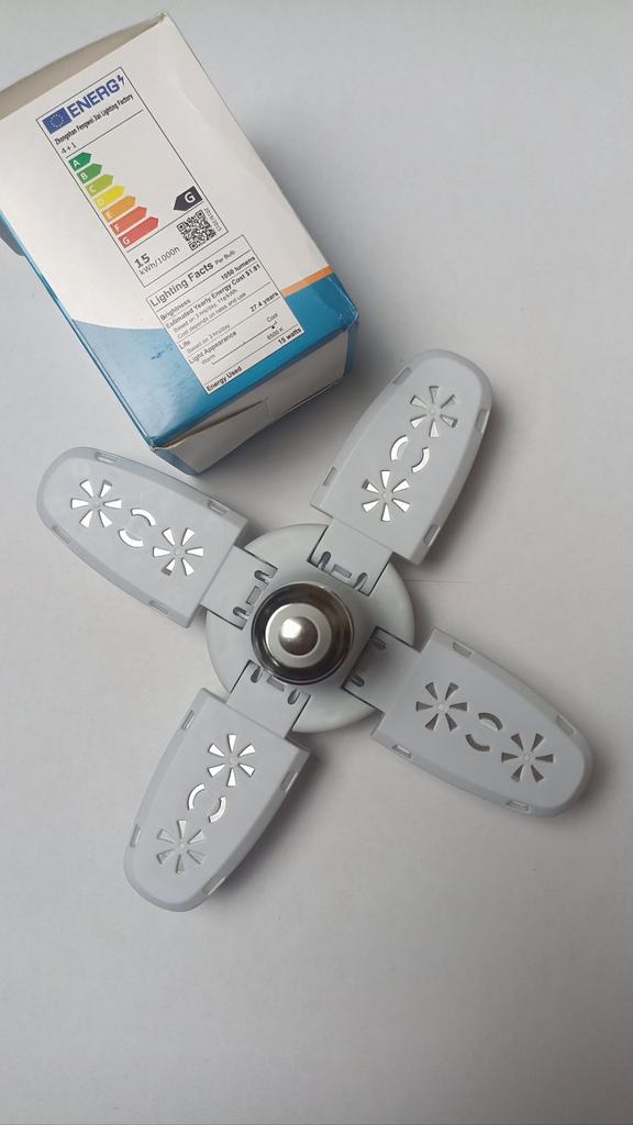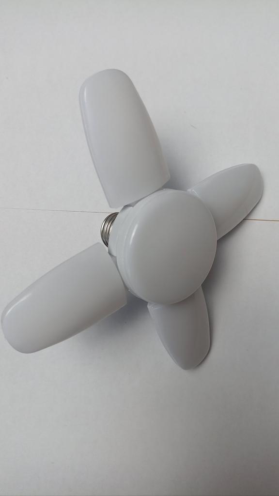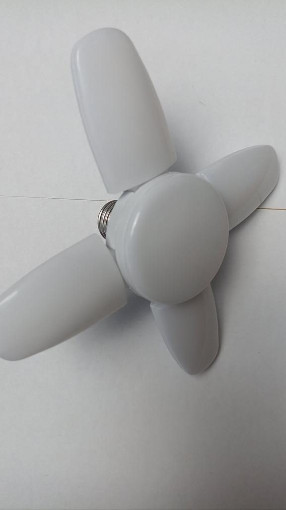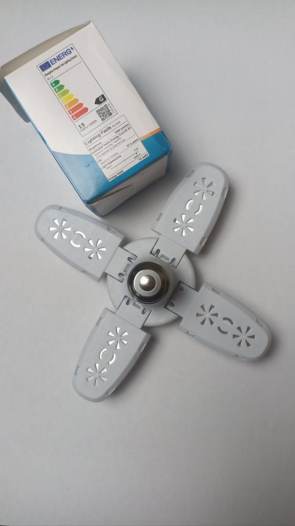 Lampadina LED E27 con pale del ventilatore pieghevoli – una soluzione intelligente per un'illuminazione forte e focalizzata - Adatta alla maggior parte dei portalampade, non sono necessari adattatori speciali. - Le lame sono deformabili e personalizzabili, quindi puoi direzionare la luce esattamente dove serve. - Fornisce illuminazione potente ed efficiente dal punto di vista energetico. - Compatibile con l'elettricità nelle case e nelle istituzioni. - Perfetta per garage, officine, magazzini, cucine o illuminazione generale a soffitto. La combinazione di una potente luce LED con un design pieghevole unico fornisce una soluzione di illuminazione su misura per le tue esigenze – semplice, efficiente e facile da installare.