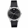 Stainless steel round case with a black dial.