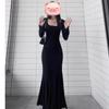 2025 new women's square neck dress women's summer slim-fitting waist little mother wind hip fish tail dress