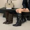 Cowhide version~ long boots femininity pointed V-mouth thin boots belt buckle but knee high thick heel knight boots