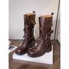 ~ Brown Western Medium Martin Boots Round Head Lace-Up Belt Buckle Buckle Thick Heel Maillard Leather Boots