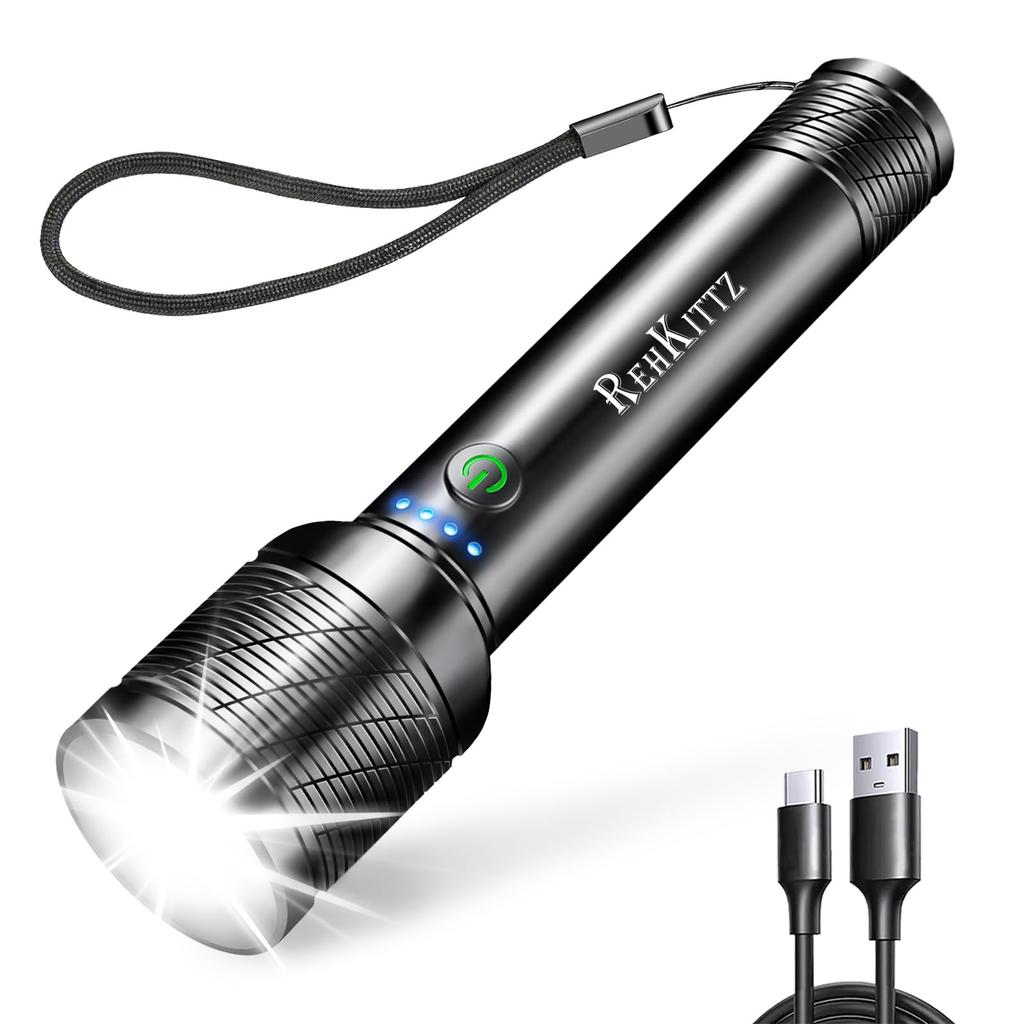 The super powerful light uses newly upgraded ultra-bright beads and chips, providing a more uniform and brighter light than traditional rechargeable flashlights, with brightness 90% higher.