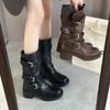 French retro western cowboy boots women's 2025 spring and autumn new high-heeled stacking boots slim pleated medium tube Martin boots